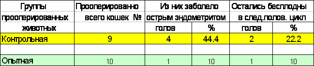 Комплексные мероприятия в пост операционный период, включающие противосептическую, патогенетическую иммунотерапию, не привели к полному восстановлению воспроизводительных качеств кошек. Отсутствие рождаемости зарегистрировано у 2 кошек (22,2%) первой группы, во второй - бесплодными осталась 1 (10%)