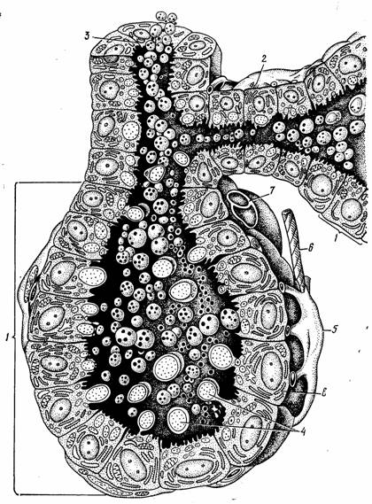 1 — ацинусы; 2 — молочный ход; 3 — внутридольковый проток; 4 — апокриновая секреция; 5 — миоэпителиальные клетки; б — нервное волокно; 7 — гемокапилляр; 8 — лактоцит.