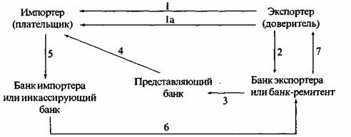 1. Экспортер заключает контракт с импортером о продаже товаров на условиях расчетов по документарному инкассо и отправляет ему товар (1а). 2. Экспортер направляет своему банку инкассовое поручение и коммерческие документы. 3. Банк экспортера пересылает инкассовое поручение и коммерческие документы представляющему банку (или банку импортера). 4. Представляющий банк предъявляет эти документы импортеру. 5. Импортер производит оплату документов инкассирующему (или своему) банку. 6. Инкассирующий банк переводит платеж банку-ремитенту (или банку экспортера). 7. Банк-ремитент зачисляет переведенную сумму на счет экспортера.