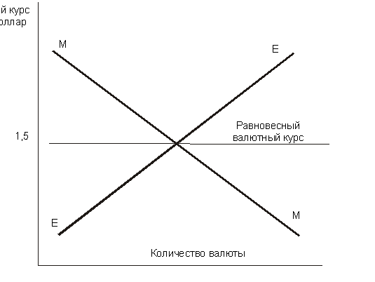 Предположим, что на рынок иностранной валюты выходят немецкие импортеры и экспортеры, ведущие торговлю с США. Кривая спроса на доллары (ММ) имеет отрицательный наклон: чем выше курс доллара, (соответственно ниже курс марки), то есть чем больше марок стоит один доллар, тем меньше спрос на доллары со стороны импортеров, поскольку американские товары становятся дороже для немцев. Компьютер в 1 тыс. долл. обойдется немцу в 2 тыс. марок при курсе 2 марки за доллар (1000 х 2) и только 1,5 тыс. марок при курсе 1,5 марки за доллар (1000 х 1,5). Кривая предложения долларов (ЕЕ) имеет положительный наклон: чем выше курс доллара (соответственно ниже курс марки), тем больше спрос на немецкие товары, так как они становятся дешевле для иностранцев. При курсе 1,5 марки за доллар машина ценой 30 тыс. марок будет стоить американцу 20 тыс. долл., а при курсе 2 марки за доллар 15 тыс. долл. Следует заметить, что кривые ММ и ЕЕ строятся для заданных уровней цен и постоянных объемах совокупного спроса в обеих странах.