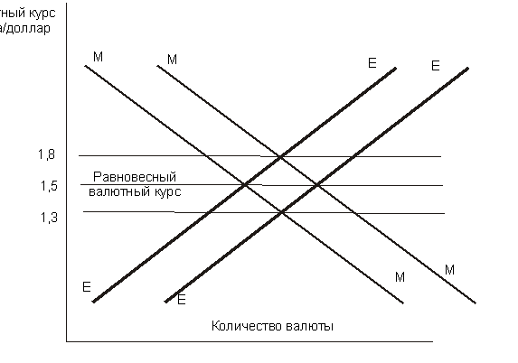 При системе свободно плавающих валютных курсов Центральный банк не вмешивается в деятельность валютного рынка и равновесный валютный курс устанавливается в точке пересечения кривых спроса и предложения.![]()