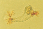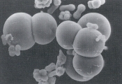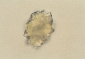 Кальция карбонат может кристаллизоваться в моче лошадей, кроликов, коз, образуя большие желто-коричневые или бесцветные сфероиды с радиальной исчерченностью, или маленькие кристаллы круглой, овальной или гантелеобразной формы (рис. 2 и 3). У собак и кошек эти кристаллы обычно не обнаруживаются. Если в моче обнаруживается гантелеобразный кристалл, то это скорее кальция оксалат моногидрат. Рис. 2. Микрофотография кристаллов кальция карбоната в мочевом осадке 7-летней кобылы (не окрашено, увеличение Х160