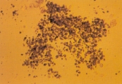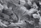 КРИСТАЛЛУРИЯ, СВЯЗАННАЯ С ЛЕКАРСТВЕННЫМИ ПРЕПАРАТАМИ Различные лекарства, выделяющиеся с мочой, могут формировать кристаллы. Чаще всего кристаллурия, связанная с применением лекарственных препаратов, возникает после использования сульфаниламидов. Сульфаниламиды могут преципитировать в моче в виде характерных снопиков, светлых или коричневатых иголочек, обычно с эксентричной связкой (рис. 27-29). Они могут также появляться как аморфные кристаллы или сфероиды с радиальной исчерченностью (рис. 30). Положительный результат теста на лигнин подтверждает диагноз сульфаниламидной кристаллурии. Составные уролиты, содержащие различные количества сульфаниламидов были обнаружены у кошек и собак. Другие виды лекарственной кристаллурии были задокументированны только у людей. Радиоактивные контрастные вещества такие как Hypaqueв (Squibb) могут преципитировать в кислой моче как плеоморфные иголочки одиночно или связками. Ампицилин может преципитировать в кислой моче как тонкие бесцветные палочки. Пиримидон может преципитировать как гексогональные пластинки, похожие на кальций оксалат моногидрат. Ципрофлоксацин может преципитировать в щелочной моче как сноп с эксцентричной связкой. Рис. 27. Микрофотография сульфодиазинового кристалла в мочевом осадке 2-летнего кастрированного самца, которому применяли триметоприм-сульфадиазин орально (не окрашено, увеличение Х 250). Рис. 28. Микрофотография сульфодиазинового кристалла в форме веера в моче кота, описанного в рис. 27 (не окрашено, увеличение Х 250). Рис. 29. Сканированная электронная микрофотография поверхности кальция оксалата, удаленного из мочевого пузыря 10-летнего кастрированного самца мальтеза. Обратите внимание на сульфадиазиновый кристалл веерообразной формы (увеличение Х 2,880). Рис. 30. Сканированная электронная микрофотография сульфодиазинового кристалла в моче кота, описанного в рис. 27 (увеличение Х 1,248).