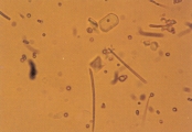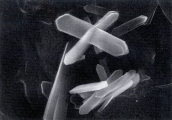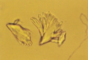 Особенности Холестероловые кристаллы обычно большие, плоские, прямоугольные пластины с характерными зарубками на углах (рис. 24). При световой микроскопии они бесцветные и прозрачные. При поляризованном свете наблюдаются различные блестящие цвета. Интерпретация У людей холестероловые кристаллы обычно связаны с массивным разрушением ткани и с нефротическим синдром и хилурией (наличие лимфы в моче). В ветеринарии еще не накоплено достаточно данных для формирования определенного опыта, однако холестеролловые кристаллы обнаруживают у, по-видимому, нормальных собак. Рис. 24. Микрофотография холестероловых кристаллов в мочевом осадке 5-летнего кобеля миниатюрного шнауцера (не окрашено, увеличение Х 100).