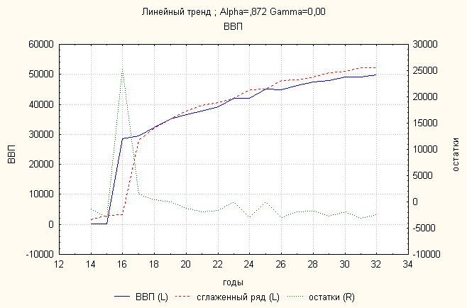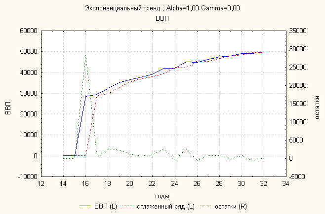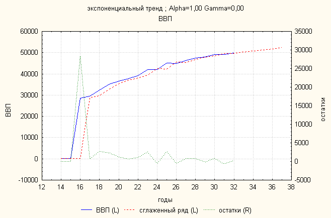 Анализ динамики ВВП показал, что экспоненциальный тренд дает наименьшую ошибку. По нему делаем прогноз:
