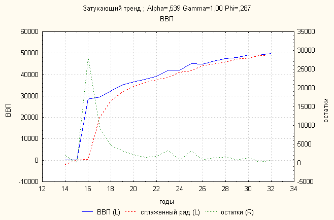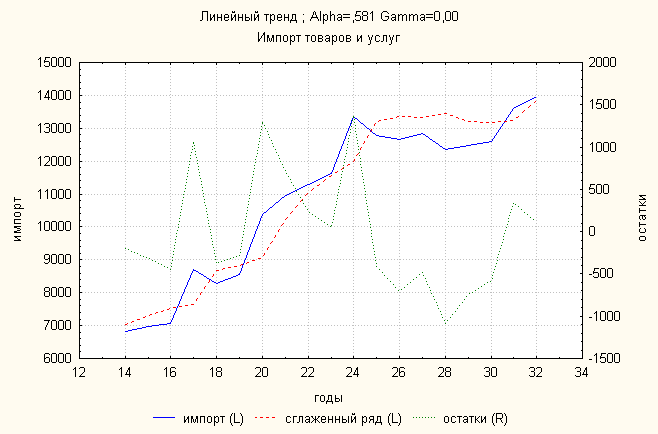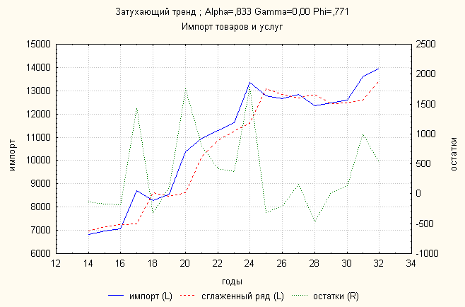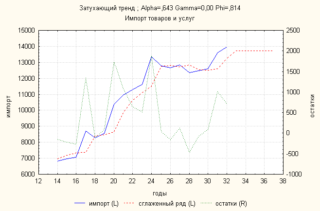 Анализ динамики импорта товаров и услуг показал, что затухающий тренд дает наименьшую ошибку. По нему делаем прогноз: