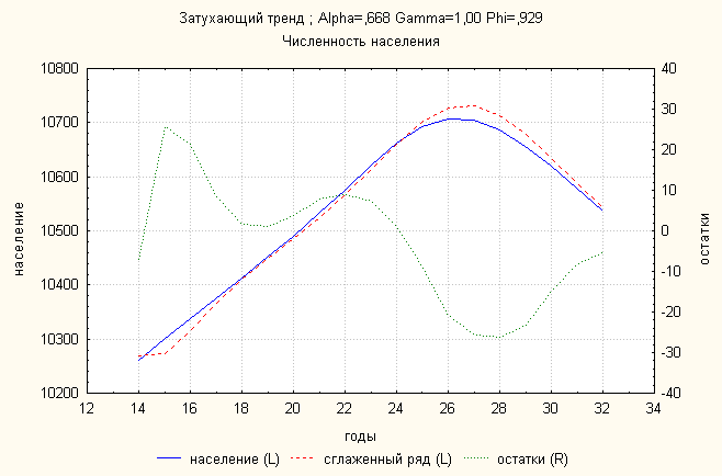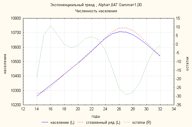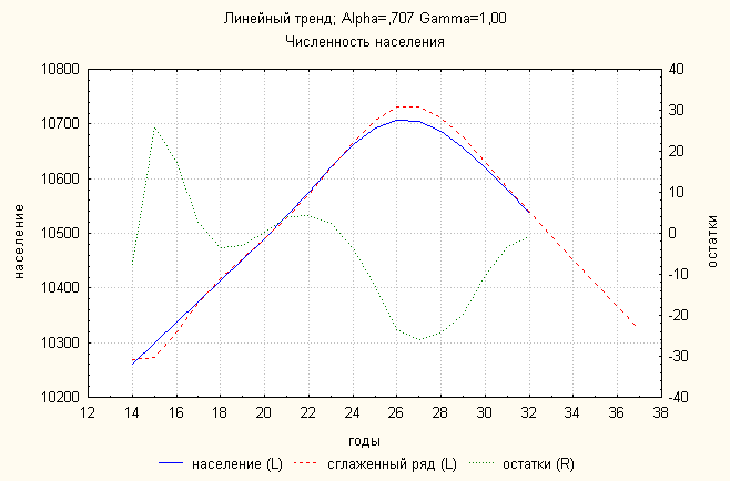 Анализ динамики численности населения показал, что линейный тренд дает наименьшую ошибку. По нему делаем прогноз:
