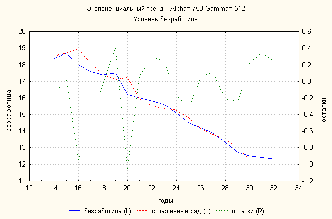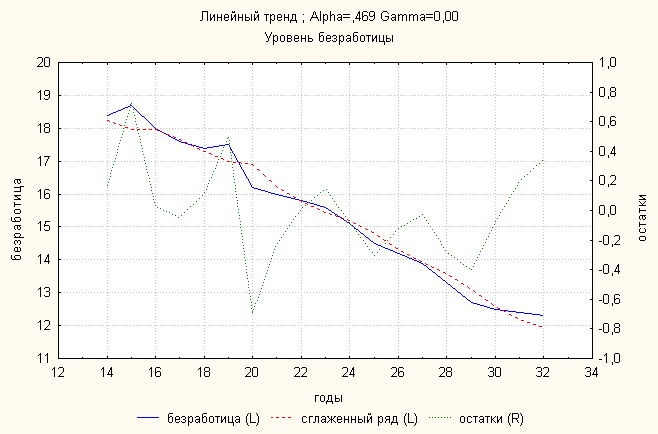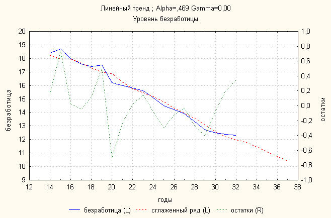 Анализ динамики уровня безработицы показал, что линейный тренд дает наименьшую ошибку. По нему делаем прогноз: