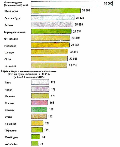 Рис.3. Страны мира с минимальными и максимальными показателями ВВП на душу населения.