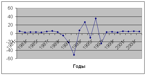 Структурные изменения ВВП по отдельным секторам носят разнообразный и разнонаправленный характер. В основном они зависят от специфики того или иного сектора. В то время, как для сельского хозяйства и сферы услуг характерны существенные колебания, в промышленности эти изменения заметны в значительно меньшей мере и отличаются большей стабильностью и наметившейся устойчивой тенденцией медленного снижения доли промышленности в ВВП. Этот процесс, начавшийся еще в начале 80-х годов, продолжился и в 90-х. Темпы развития в промышленности отстают с годовым запозданием от темпов ВВП, причем наибольший спад был зафиксирован в 1991г. В сельском хозяйстве наименьший темп был зарегистрирован в 1993г., несмотря на то, что отрицательные значения произведенного ВВП в этой области наблюдались и ранее, особенно в 1983г., 1985г. и 1987г. В сфере услуг также наблюдаются существенные колебания, однако спады темпов не столь ярко выражены. В исследуемом периоде был зафиксирован наиболее низкий темп прироста национального дохода, составивший в 1991г. -22%, что можно было бы сравнить разве с аналогичным показателем в послевоенном 1945г.