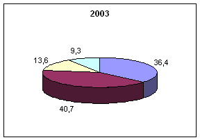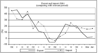 По предварительным данным в евро торговое сальдо за период с Январь по Август 2003 г. отрицательно (–1 258.3 млн. евро, 7.1% от ВВП), что есть на 368.7 млн. евро больше по сравнению с соответствующим периодом 2002 г. (–889.7 млн. евро, 5.4% от ВВП). В результате совместное влияние на цены оказали падение цен на нефть и нефтяные продукты и природный газ. Экспорт в Августе 2003 г. составил 542.6 млн. евро, что на 2.3%