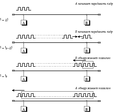 Рис. 3. Схема возникновения коллизии в методе случайного доступа CSMA/CD (tp - задержка распространения сигнала между станциями A и B)