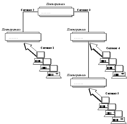 При описании топологии сети стандарта 10Base-5 приводились ограничения на длину одного непрерывного отрезка коаксиального кабеля, используемого в качестве общей шины передачи данных для всех станций сети. Отрезок кабеля, завершающийся на обоих концах терминаторами и имеющий общую длину не более 500 м называется физическим сегментом сети. Однако при расчете окна коллизий общая максимальная длина сети 10Base-5 считалась равной 2500 м. Противоречия здесь нет, так как стандарт 10Base-5 (впрочем как и остальные стандарты физического уровня Ethernet) допускает соединение нескольких сегментов коаксиального кабеля с помощью повторителей, которые обеспечивают увеличение общей длины сети.