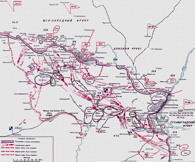Развивая наступление, войска Сталинградского фронта к исходу 22 ноября вышли на рубеж населенных пунктов Нариман – Варваровка – Рокотино – западный берег реки Червленой и охватили с юга и юго-запада главную группировку немецко-фашистских войск в районе Сталинграда. Обе железные дороги, расположенные восточнее реки Дон, оказались перерезанными.
