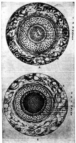Рис. 243. Поперечные срезы корня волоса на уровне дна сальной железы (4) и на уровне нижней части корня (Б);
