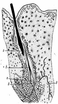 а — волосяной сосочек; б — волосяная луковица; в — новый волос; г — старый волос; д — нервные волокна.