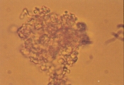 Рис. 19. Микрофотография аморфных кристаллов кальция фосфата в моче 3-летнего самца Лхасского Апсо. У собаки были обнаружены камни оксалата кальция в мочевом пузыре (не окрашено, увеличение Х 250).