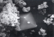 Рис. 20. Сканированная электронная микрофотография кристалла кальция оксалата дегидрата и нескольких аморфных кристаллов кальция фосфата в моче собаки, описанной в рис. 19 (увеличение Х 7,920).