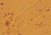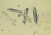 КРИСТАЛЛУРИЯ ГИППУРОВОЙ КИСЛОТЫ Кристаллы гиппуровой кислоты бесцветные, удлиненные образования различной величины. Обычно они имеют шесть сторон, которые соединены закругленными углами. Эти кристаллы снова привлекли внимание ветеринарных специалистов по причине их возможной связи с этиленгликолевым отравлением собак и кошек. Однако в последних исследованиях кошек и собак с этиленгликолевым отравлением кристаллы мочи, напоминающие под световым микроскопом кристаллы гиппуровой кислоты, при рентгенографической дефракции оказались кальций оксалат моногидратом. Истинные кристаллы гиппуровой кислоты, по-видимому, редко встречаются у собак и, следовательно, мало известна их значимость.