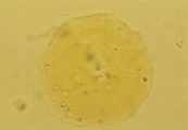 Рис. 23. Микрофотография больших кристаллов кальций фосфат дегидрата и характерных кристаллов кальций оксалат дегидрата в моче лошади (не окрашен, увеличение Х 25). ЛЕЙЦИНОВАЯ КРИСТАЛЛУРИЯ Лейциновые кристаллы обычно появляются как большие желтые или коричневые сферы с радиальной концентрической слоистостью (рис 31). Однако такие сферы могут быть не чисто лейциновыми, так как сообщалось, что кристаллы чистого лейцина напоминают гексагональные пластины. У людей лейциновые кристаллы свидетельствуют о тяжелом заболевании печени. Значение лейциновых кристаллов для кошек и собак хорошо не изучено.