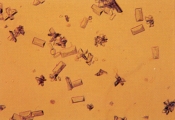 КАЛЬЦИЙ ФОСФАТНАЯ КРИСТАЛЛУРИЯ Было установлено, что когда кальций фосфат осаждается из водного сильно насыщенного раствора при pH более 7, сначала появляются аморфные фосфаты. Аморфный осадок может медленно трансформироваться в стабильный кристаллический преципитат вследствие процесса растворения, ренуклеации и роста кристаллов. Скорость трансформации зависит от pH. Стабильность аморфных фосфатов улучшается при высоком pH. Интерпретация Внимательно следует отнестись к интерпретации аморфных кристаллов при световой микроскопии, так как они могут быть сформированы из разных видов кристаллов, включая фосфат кальция, аммония урат и ксантин. По нашему опыту, большинство кристаллов, состоящих из кальция фосфата, обнаруживалось у, по-видимому, нормальных собак с персистентно щелочной мочой, у собак с кальций фосфатным уролитиазом и собак с уролитами, состоящими из смеси кальция фосфата и кальция оксалата. Небольшое количество кристаллов кальция фосфата может встречаться вместе со струвитными кристаллами, вызванными инфекцией.