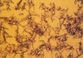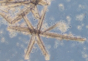 Рис. 22. Микрофотография кристаллов кальция фосфат дегидрата в мочевом осадке 3-летнего кобеля миниатюрного шнауцера, у которого обнаружены камни оксалата кальция в мочевом пузыре (не окрашено, увеличение Х 40).