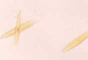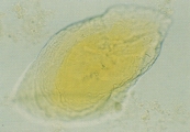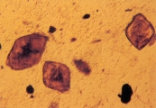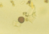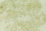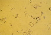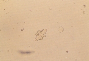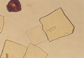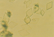 КРИСТАЛЛУРИЯ МОЧЕВОЙ КИСЛОТЫ Особенности Кристаллы мочевой кислоты часто встречаются желтого или желто-коричневого цвета различных форм. Наиболее характерная форма - алмаза или ромбической пластины с концентрическими кругами (рис. 57-61). Также они могут встречаться в виде розеток, состоящих из нескольких агрегированных кристаллов мочевой кислоты. Иногда они встречаются как ромбические пластины с одним или несколькими парными выступами по бокам (рис. 62-63). Гораздо реже они встречаются в форме шестигранных кристаллов, напоминая цистин. Однако, шестигранные кристаллы всегда встречаются вместе с типичными кристаллами алмазной или ромбовидной формы. Кристаллы мочевой кислоты растворимы в гидроксиде натрия, но нерастворимы в спирте, соляной кислоте и уксусной кислоте. Интерпретация Являясь довольно распространенной среди людей, кристаллурия мочевой кислоты нечасто встречается у собак и кошек. Кристаллы мочевой кислоты формируются после добавления 10% уксусной кислоты в мочевой осадок собак и кошек, содержащий аморфные кристаллы мочевой кислоты и аммония урата. Также могут формироваться кристаллы натрия урата. Необходима выдержка 20-30 мин. для уксусной кислоты чтобы кристаллы стали видимыми. Если оставить их на ночь с влажной губкой в чашке Петри, то они могут выпасти.
