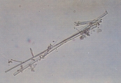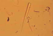 Рис. 42. Микрофотография игольчатых кристаллов в мочевом осадке собаки. Кристаллы в форме иголок могут состоять из тирозина, сульфата кальция, урата натрия, ампицилина или радиоконтрастных агентов (не окрашено, увеличение Х 160).