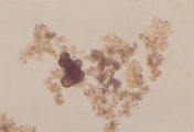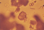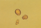 УРАТЫ АММОНИЯ И АМОРФНЫЕ УРАТНЫЕ КРИСТАЛЛЫ Особенности Кристаллы урата аммония (также наываемые биурата аммония) обычно обнаруживаются в слегка закисленной, нейтральной или щелочной моче. Они, как правило, желтого или желто-коричневого цвета, сферической формы с длинными иррегулярными выступами (так называемое колючее яблоко) (рис. 43-51). Соли уратов натрия, калия, магния могут преципитировать в виде аморфных образований в кислой моче (так называемые аморфные ураты). Они могут напоминать аморфные фосфаты (рис. 49), но способны растворяться в щелочной среде. При росте аморфных кристаллов (рис. 47-51) они приобретают желтую или желто-коричневую окраску. Ураты натрия могут преципитировать как бесцветные или желтоватые иголочки или как тонкие призмы в связке или пучках (рис. 52-56). Ураты аммония и аморфные кристаллы урата нерастворимы в кислой моче. Однако, добавление 10% уксусной кислоты в мочевой осадок, содержащий эти кристаллы, часто приводит к выделению мочевой кислоты и иногда кристаллов натрия урата. Добавление уксусной кислоты к аморфным кристаллам фосфата приводит к их быстрому растворению, в то время как они продолжают сохраняться в осадке щелочной мочи. Интерпретация Аммония ураты и аморфные ураты могут встречаться у, по-видимому, нормальных собак и кошек. Часто они обнаруживаются у собак с портальными сосудистыми аномалиями с или без сопутствующими аммоний уратными уролитами. Также они распространены среди далматинов, английских бульдогов и других собак и кошек по причинам, несвязанным с портальными сосудистыми аномалиями.