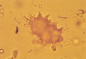 Рис. 44. Микрофотография кристалла аммония урата в виде колючего яблока в мочевом осадке 7-месячного йоркширского терьера с портальной сосудистой аномалией (не окрашено, увеличение Х 250).
