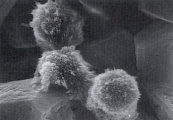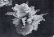 Рис. 50. Сканированная электронная микрофотография аморфных кристаллов аммония урата, смежных с кристаллами мочевой кислоты в закисленном мочевом осадке собаки, описанной в рис. 49 (увеличение Х 5,400).