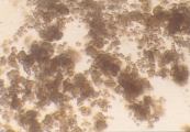 Рис. 49. Микрофотография аморфных кристаллов аммония урата в мочевом осадке 7-летнего аляскинского маламута с аммоний уратными камнями в мочевом пузыре (не окрашено, увеличение Х 128).