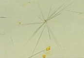 ТИРОЗИНОВАЯ КРИСТАЛЛУРИЯ Тирозиновые кристаллы обнаруживаются как рефрактерные, бесцветные или желтые игольчатые кристаллы, расположенные группами (рис. 42). У людей они встречаются при тяжелых заболеваниях печени.