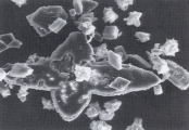 Рис. 63. Сканированная электронная микрофотография различных форм кристаллов мочевой кислоты в закисленном мочевом осадке собаки, описанной в рис.49 (увеличение Х 792).