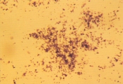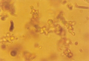КСАНТИНОВАЯ КРИСТАЛЛУРИЯ Ксантин может преципитировать в аморфное образование в кислой моче, особенно у собак и кошек, получающих аллопуринол. Аморфные кристаллы ксантина напоминают аморфные уратные кристаллы (рис.64-66). У людей возникновение ксантиновой кристаллурии отмечается при возникновении возрастной или старческой ксантиурии.
