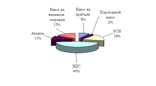 Структура поступлений налогов и сборов в федеральный бюджет по видам налогов за 2003 год. [2, с. 102]