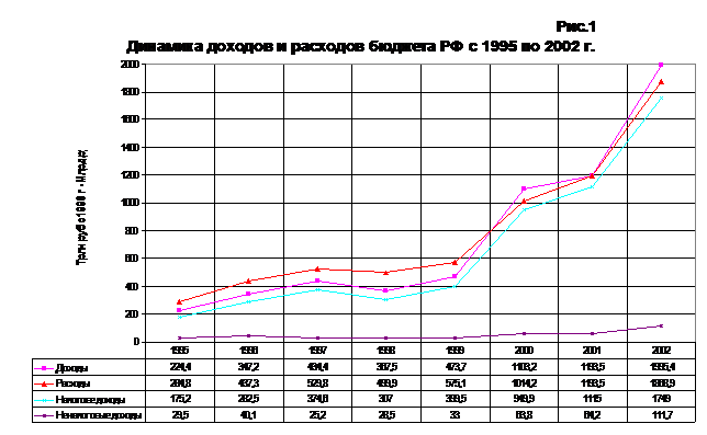 На Рис. 1 представлены параметры налоговых и неналоговых доходов, а также расходов бюджета РФ в динамике с 1995 по 2002 год. Так как неналоговые поступления бюджета даже в период становления новой российской экономики при массовой продаже государственной собственности были значительно меньше, чем налоговые, а вначале 90-х годов дефицит бюджета покрывался за счет внешних заимствований, то можно сделать вывод, что основой дальнейшего нормального экономического развития нашей страны могут быть только налоговые поступления.