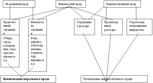 Ниже приведенная схема показывает, что физический вред возмещается путем возмещения морального и имущественного вреда, вызванных телесным вредом.