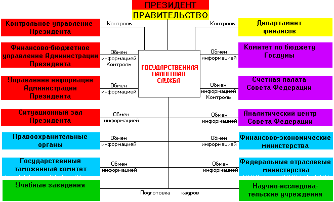 Государственная налоговая служба (ГНС РФ) - система федеральных и территориальных органов государственного управления, осуществляющих контроль за соблюдением налогового законодательства. Организация этой службы связана с необходимостью активного использования финансовых рычагов, в. частности повышением роли налогов, обусловленным перестройкой экономики страны. Органы налоговой службы были выделены в особую систему из структур финансовых органов (Министерства финансов, финансовых управлений и отделов). Начало такой реорганизации было положено Постановлением Совета Министров СССР от 24 января 1990 г. "О Государственной налоговой службе". До этого в финансовых органах имелись подразделения, ведавшие вопросами взимания налогов и других обязательных платежей. Деятельность налоговых органов была урегулирована Законами "О правах, обязанностях и ответственности государственных налоговых инспекций" от 21 мая 1990 г. и "О Государственной налоговой службе" от 21 марта 1991 г. Главная задача ГНС РФ заключается в обеспечении единой системы контроля за соблюдением налогового законодательства, за правомерностью исчисления, полнотой и своевременностью внесения в бюджет налогов и других обязательных платежей, установленных законодательством РФ и ее субъектов. В связи с этой задачей органы ГНС РФ контролируют соблюдение законодательства о предпринимательской деятельности, законность сделок. В систему органов ГНС РФ входят: Федеральная налоговая служба России, выполняющая функции центрального федерального органа, а также государственные налоговые инспекции по республикам в составе РФ, краям, областям, автономным образованиям, районам, городам (за исключением городов районного подчинения) и районам в городах. Это единая централизованная система органов, подчиняющаяся Президенту РФ и Правительству РФ. Каждый из названных органов является юридическим лицом. Основное звено в системе органов ГНС РФ - государственные налоговые инспекции по районам и городам. Именно на них возложено осуществление непосредственно контрольных функций. Исходя из этого построена их внутренняя структура: выделены отделы по видам налоговых платежей (например, отдел налогов с доходов предприятий, отдел налогов с доходов физических лиц, отдел местных налогов и др.). Кроме того, существует функциональный отдел отчетности и учета. Деятельность центрального органа - Федеральной налоговой службы России включает, помимо непосредственно контрольных функций, организационно-методическую и контролирующую работу в отношении нижестоящих налоговых органов, а также координацию деятельности органов налоговой службы с другими контролирующими и правоохранительными органами. По вопросам своей компетенции этот орган издает инструкции и другие нормативные документы. Подобные функции в соответствующих территориальных пределах выполняют государственные налоговые инспекции по республикам, краям, областям, автономным образованиям и городам с районным делением. В заключении хочу привести схему взаимодействия Государственной налоговой службы РФ с министерствами и ведомствами по формированию налоговой политики.