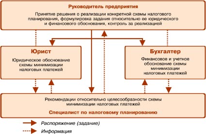 случае если отдел налогового планирования на предприятии не создается, к реализации отдельных схем по минимизации налоговых платежей целесообразно привлекать, кроме руководителя предприятия, юриста, бухгалтера и специалиста по налоговому планированию.