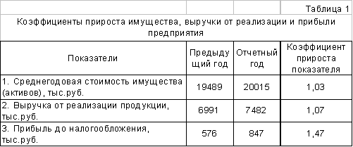 На первом этапе выполнения аналитической части работы рассмотрим коэффициенты прироста имущества, выручки и от реализации и прибыли предприятия за период 2003-2004 гг., являющихся налогооблагаемой базой для основных налогов предприятия: налога на имущество, НДС и налога на прибыль.
