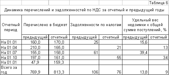Анализируя данные, представленные в таблице 6, можно сделать вывод о том, что удельный вес недоимок в сумме налоговых платежей по НДС довольно значителен и колеблется в пределах 9– 13,8 % за анализируемый период. Отметим, что в динамике удельный вес недоимки снизился на 4,8 %, что весьма существенно.