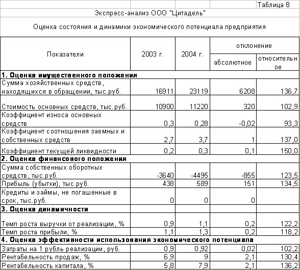 Для того, чтобы провести экспресс- анализ деятельности предприятия за 2003-2004 гг. рассчитаем таблицу 8.