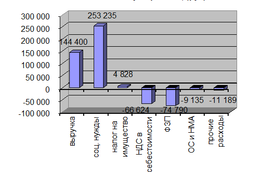 Как видно из приведенной диаграммы, основное влияние на прирост балансовой прибыли, а следовательно, и на величину чистой прибыли, оказывает уменьшение расходов организации на социальные нужды. Это связано с освобождением организации от обязанности уплаты единого социального налога в 2005 г вследствие перехода ее с 1 января 2005 г на УСНО. Налоговой базой, для указанного налога, является фонд заработной платы, а как видно из приведенных выше круговых диаграмм, фонд заработной платы является основным элементом расходов организации (он составил 60,6% в 2004 г и 60,1% в 2005 г в общем объеме выручки). Следовательно, освобождение от обязанности уплаты единого социального налога привело к сокращению расходов и увеличению чистой прибыли, которая может быть использована организацией для целей ее дальнейшего развития.