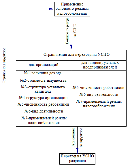 В соответствии со статьёй ст. 346.12 налогоплательщиками признаются организации и индивидуальные предприниматели, перешедшие на УСНО и применяющие её в установленном порядке. Для реализации права перехода на УСНО организациями и индивидуальными предпринимателями должны соблюдаться ряд ограничений, которые показаны на рисунке 1.1 и описаны ниже.