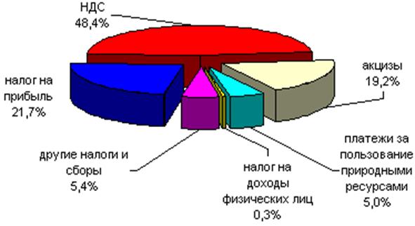 Рис. 1.2 Структура поступлений налогов и сборов в федеральный бюджет по видам налогов за январь-декабрь 2004 года (в %)