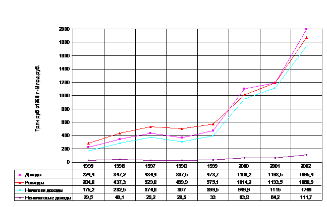 На графике представлены параметры налоговых и неналоговых доходов, а также расходов бюджета РФ в динамике с 1995 по 2002 год. Так как неналоговые поступления бюджета даже в период становления новой российской экономики при массовой продаже государственной собственности были значительно меньше, чем налоговые, а вначале 90-х годов дефицит бюджета покрывался за счет внешних заимствований, то можно сделать вывод, что основой дальнейшего нормального экономического развития нашей страны могут быть только налоговые поступления.