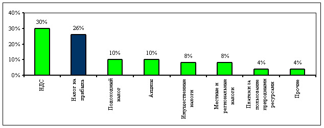 Налог на прибыль предприятий служит инструментом перераспределения национального дохода и является одним из главных доходных источников федерального бюджета, а также региональных и местных бюджетов. Если рассматривать структуру доходов бюджета российской федерации, то будет видно, что доля налога на прибыль уступает по величине лишь доле налога на добавленную стоимость (см.рис.1). [7. 42]