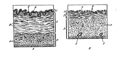 Рис. 202. Схема строения стенки артерии (А) и вены (Б) мышечного типа: