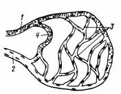 1 — внутренняя оболочка; 2 — средняя оболочка; 3 — наружная оболочка; а — эндотелий; б — внутренняя эластическая мембрана; в — ядра клеток гладкой мышечной ткани в средней оболочке; г — ядра клеток соединительной ткани адвентиции; д — сосуды сосудов.